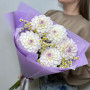 На фото букет из 5 белых георгин с ромашками. В составе: георгина 5 шт, танацетум 3 шт, дизайнерская упаковка 1 шт, атласная лента 1 шт, . Все цветы свежие и ароматные, букет красиво оформлен и отлично подходит для подарка. Доступна доставка цветов или самовывоз.