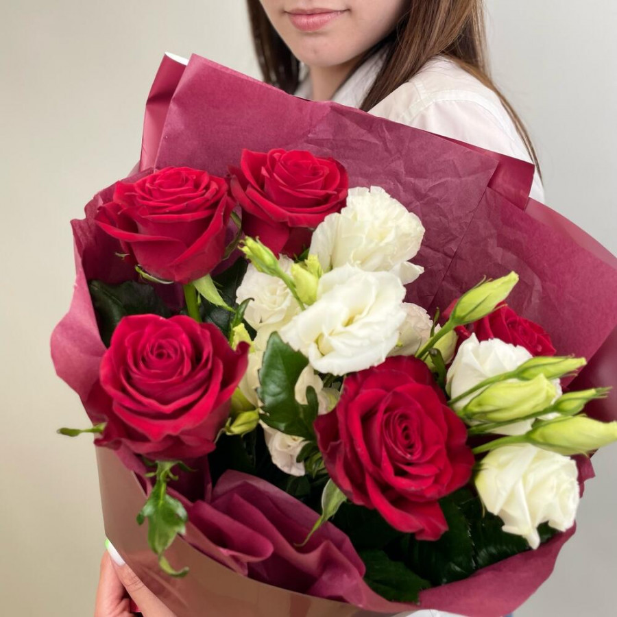 На фото букет «гранатовый сад». В составе: роза 5 шт, эустома (лизиантус) 3 шт, дизайнерская упаковка 2 шт, атласная лента 1 шт, . Все цветы свежие и ароматные, букет красиво оформлен и отлично подходит для подарка. Доступна доставка цветов или самовывоз.