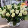 На фото композиция 31 белой розы в белой корзине. В составе: роза 31 шт, корзина (m) 1 шт, . Все цветы свежие и ароматные, букет красиво оформлен и отлично подходит для подарка. Доступна доставка цветов или самовывоз.